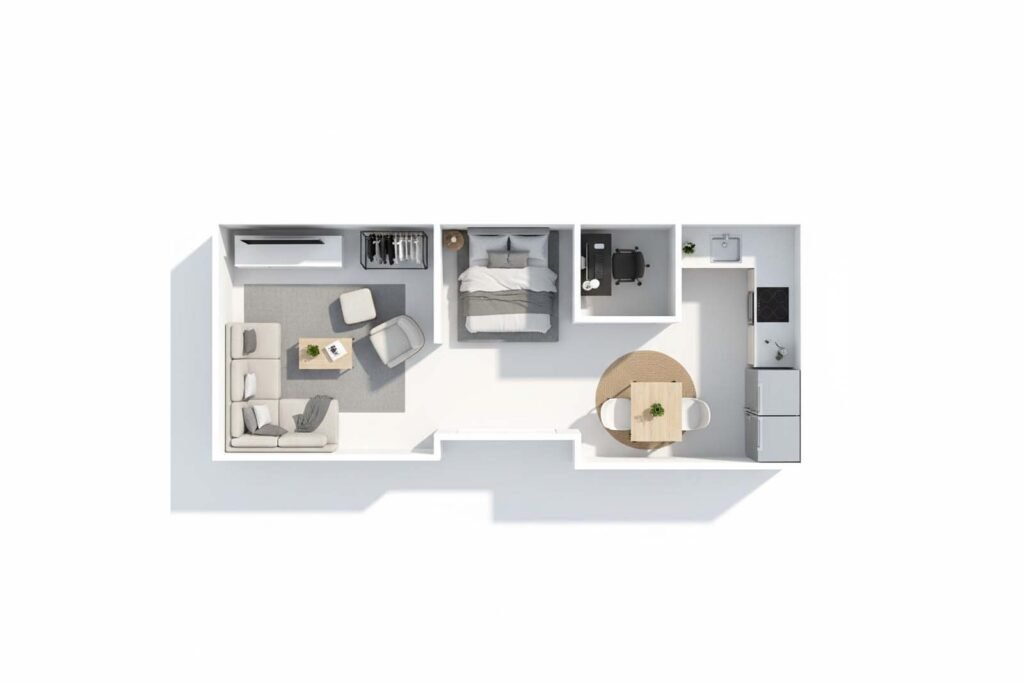 Voici une répartition pratique des différentes zones dans un studio. Cette organisation favorise une utilisation rationnelle de l’espace et une séparation claire des activités.