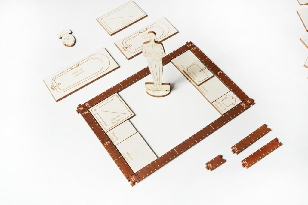 Le kit Yoja est un outil à l'échelle 1/25 qui vous permet de visualiser l'aménagement de votre salle de bain et de tester différentes configurations avant de vous lancer. Vous déplacez la douche, la vasque et les rangements, vous vérifiez les dégagements et vous vous assurez d'un agencement fluide au quotidien.